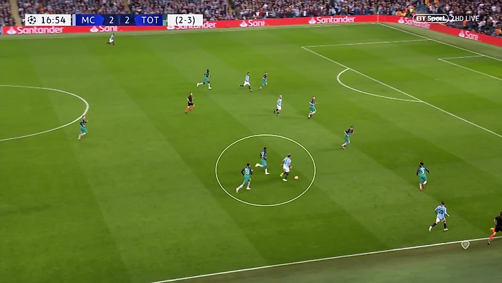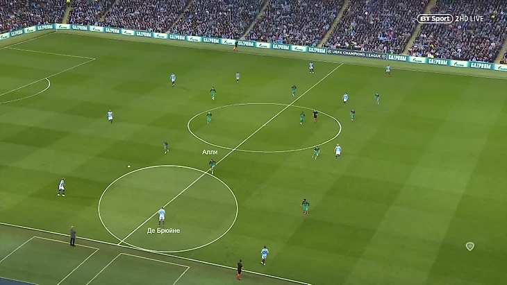 «Тоттенхэм» в ромбе, Де Брюйне на фланге. Алли накроет его с опозданием, у бельгийца будет достаточно времени на обработку: