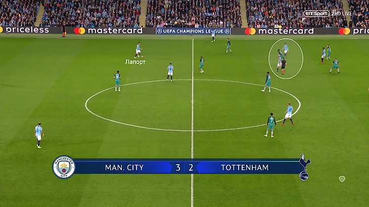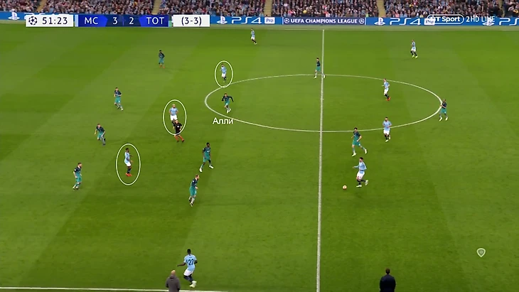 Перед первым голом Алли, Эриксен и оттянувшийся Моура в опорной зоне «Сити» играли против Де Брюйне и Гюндогана. Алли получит мяч свободным и сделает пас вразрез, это поставит Лапорта в трудное положение: