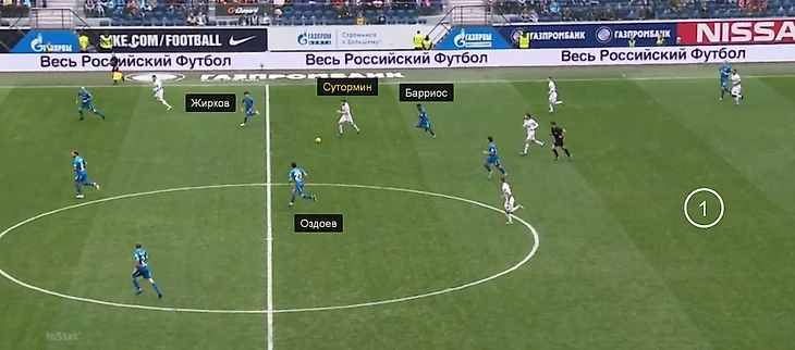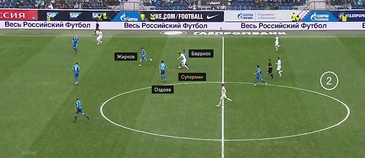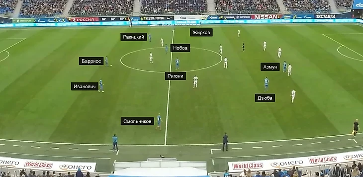В остальных весенних матчах «Зенита» к Ивановичу и Ракицкому опускался только Барриос. Оздоев, Нобоа и Кузяев располагались выше, обычно – на одной вертикальной линии с Барриосом. При этом фланговые полузащитники либо уходят в полуфланги и освобождают края для подключения защитников, либо один из крайних хавбеков (чаще всего Дриусси, но бывает и Ригони) вообще смещаются в центр к Оздоеву.