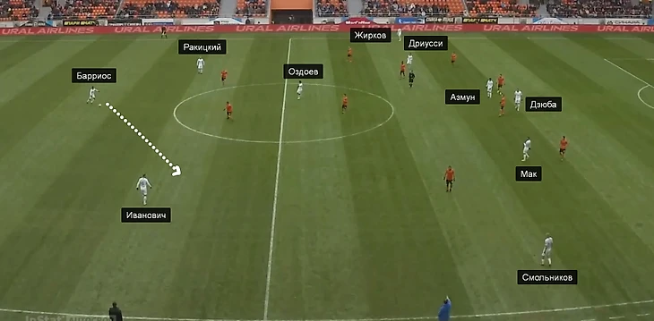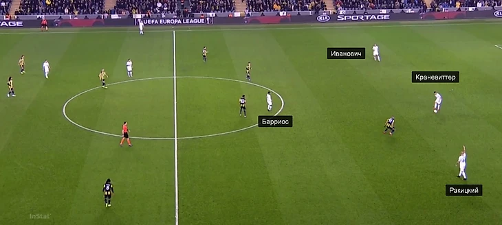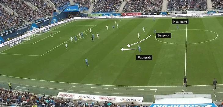 В первом матче 2019-го в Стамбуле главный тренер «Зенита» явно перестраховался: в центре поля вместе вышли Барриос и Краневиттер (такой вариант вообще не наигрывался в контрольных матчах). В начале позиционных атак Краневиттер обычно опускался на одну линию с Ивановичем и Ракицким, а Барриос располагался выше (хотя иногда они менялись местами).