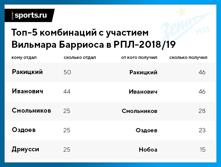 От Барриоса действительно не требуют обострения в финальной трети поля: за шесть матчей в РПЛ он отдал только 5 передач в чужую штрафную, из которых 1 стала точной (на Ригони в матче с «Анжи»). Для сравнения: второй центральный полузащитник «Зенита» Оздоев за этот же отрезок сделал 19 пасов к воротам соперника, хотя в матчах с «Уфой» и «Спартаком» выходил только на замену (у Вильмара все матчи – в старте).