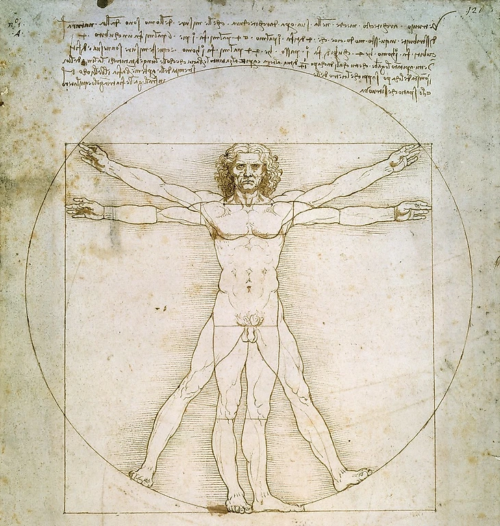 «Витрувианский человек» – изображение, созданное Леонардо да Винчи примерно в 1490-1492 годах как иллюстрация для книги, посвященной трудам античного римского архитектора Витрувия. На нем изображена фигура обнаженного мужчины в двух наложенных одна на другую позициях: с разведенными в стороны руками и ногами, вписанная в окружность; с разведенными руками и сведенными вместе ногами, вписанная в квадрат.
