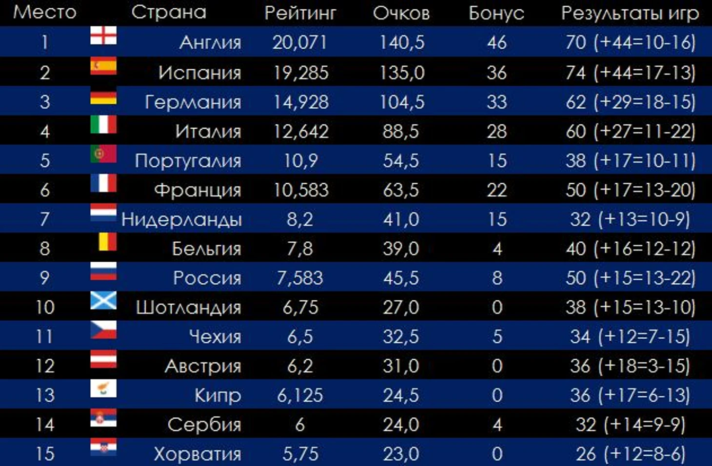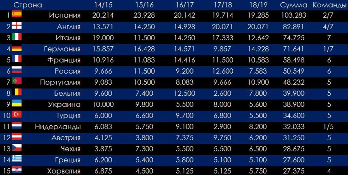 Португалия в нынешнем сезоне набрала 10,900. Этот результат оказался пятым сразу после четверки (Испания, Англия, Италия, Германия), в которой лучшими являются англичане. Вообще Англия и Испания в этом розыгрыше выглядят инопланетянами. У них огромный отрыв даже от других стран с высококонкурентными чемпионатами. Россия лишь на 9-м месте - хуже Голландии, Бельгии и Франции. Еще четыре ассоциации с постсоветского пространства в 30-ке: Украина (16), Белоруссия (21), Казахстан (23), Литва (30).