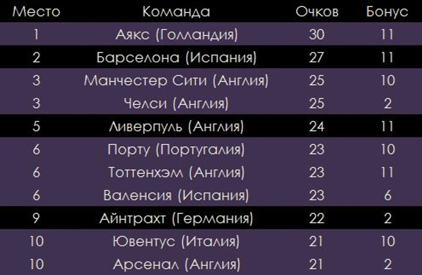 Напомню, клубный рейтинг не прямо синхронизируется с рейтингом помощи клуба ассоциации в накоплении баллов. Лучше всех помогает своей стране в этом сезоне «Аякс» - 30 очков (11 бонусами). Если отбросить бонусы, лучше всех – «Челси» - 23 очка. «Айнтрахт» обошел по пользе «Баварию», а «Валенсия» была полезней, чем лучшая команда клубного рейтинга - «Реал». Пример «Аякса» должен стать заразительным. Если команда из чемпионата вне ТОП-10 смогла пройти настолько далеко в ЛЧ, значит и команды из 6-го чемпионата Европы смогут научиться выходить из группы, может быть даже с первых двух мест.