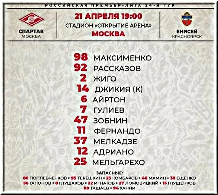 Но давайте посмотрим, а что же вообще предоставил Кононов (или не он ставит состав, да это по моему уже и не столь важно) оборонным редутам красноярцев, руководимых тренером, ляпнувшим на конференции, что "Спартаку" очки нужнее?!