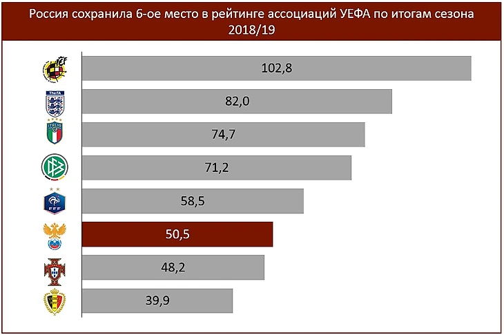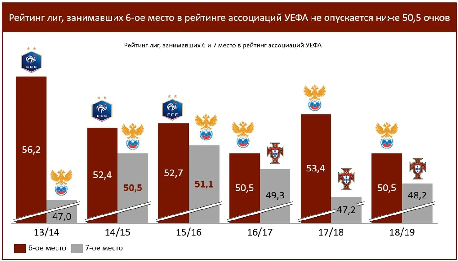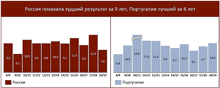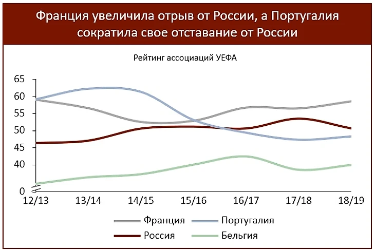 Также за прошедший сезон отставание России от Франции увеличилось. В целом, Франция, начиная с сезона 15/16 увеличивает свой клубный рейтинг. Португалии, в свою очередь, удалось выйти из крутого пике, при котором у них ежегодно снижался рейтинг, и серьезно сократила отставание от России в рейтинге УЕФА, которое образовалось по итогам сезона 17/18. Португалия впервые с сезона 14/15 повысила свой клубный рейтинг.