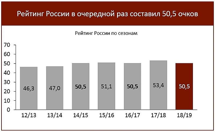 Рейтинг России идет по достаточно привычной синусоиде, то повышаясь, то опускаясь. В сезоне 18/19 рейтинг составил 50,5 очков, примерно такой же рейтинг был у России и в сезонах 14/15 и 16/17.