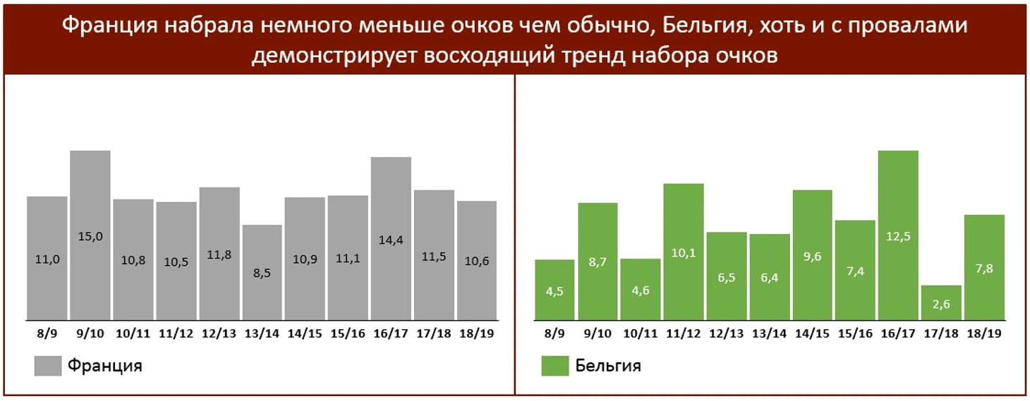 Франция набрала меньше очков, чем набирала в последние годы, тем не менее этих очков достаточно, чтобы не дать приблизиться России и Португалии. Необходимо отметить и Бельгию, которая с каждым годом набирает все больше очков. Если бы не провал прошлого сезона, то Бельгия могла бы находиться гораздо ближе к Португалии и России.