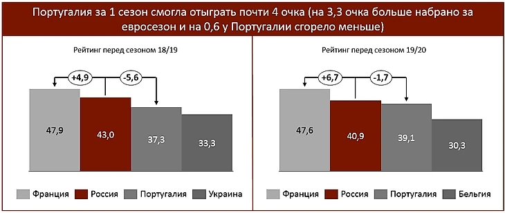 Россия в нынешнем сезоне набрала наименьшее количество очков начиная с сезона 9/10, Португалия же, наоборот, показала лучший результат за последние 6 лет. Более высокие результаты команды из этой страны показывали только в сезонах 10/11-12/13, те результаты позволяли португальской лиге находиться на 5‑ой строчке рейтинга УЕФА.
