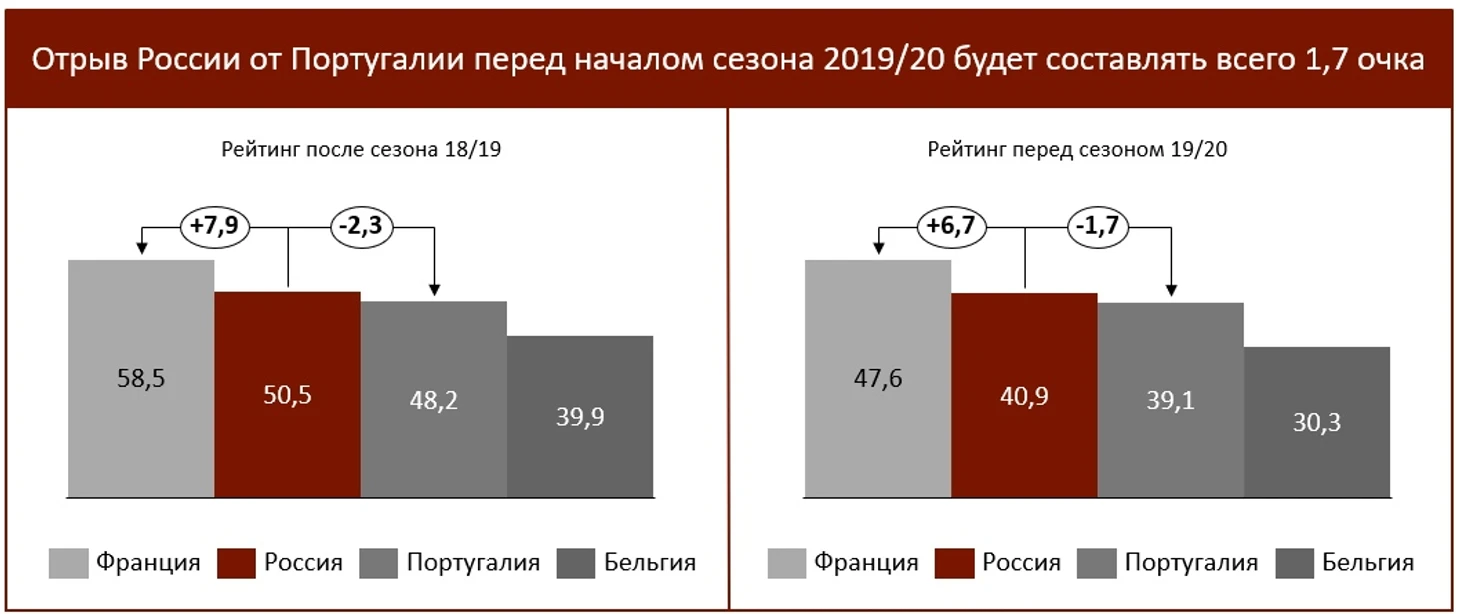 Как мы видим ниже, Франция от России довольно далека, а Португалия по итогам нынешнего сезона оказалась довольно близко к нам. Разница в рейтинге составляет всего 2,3 очка.