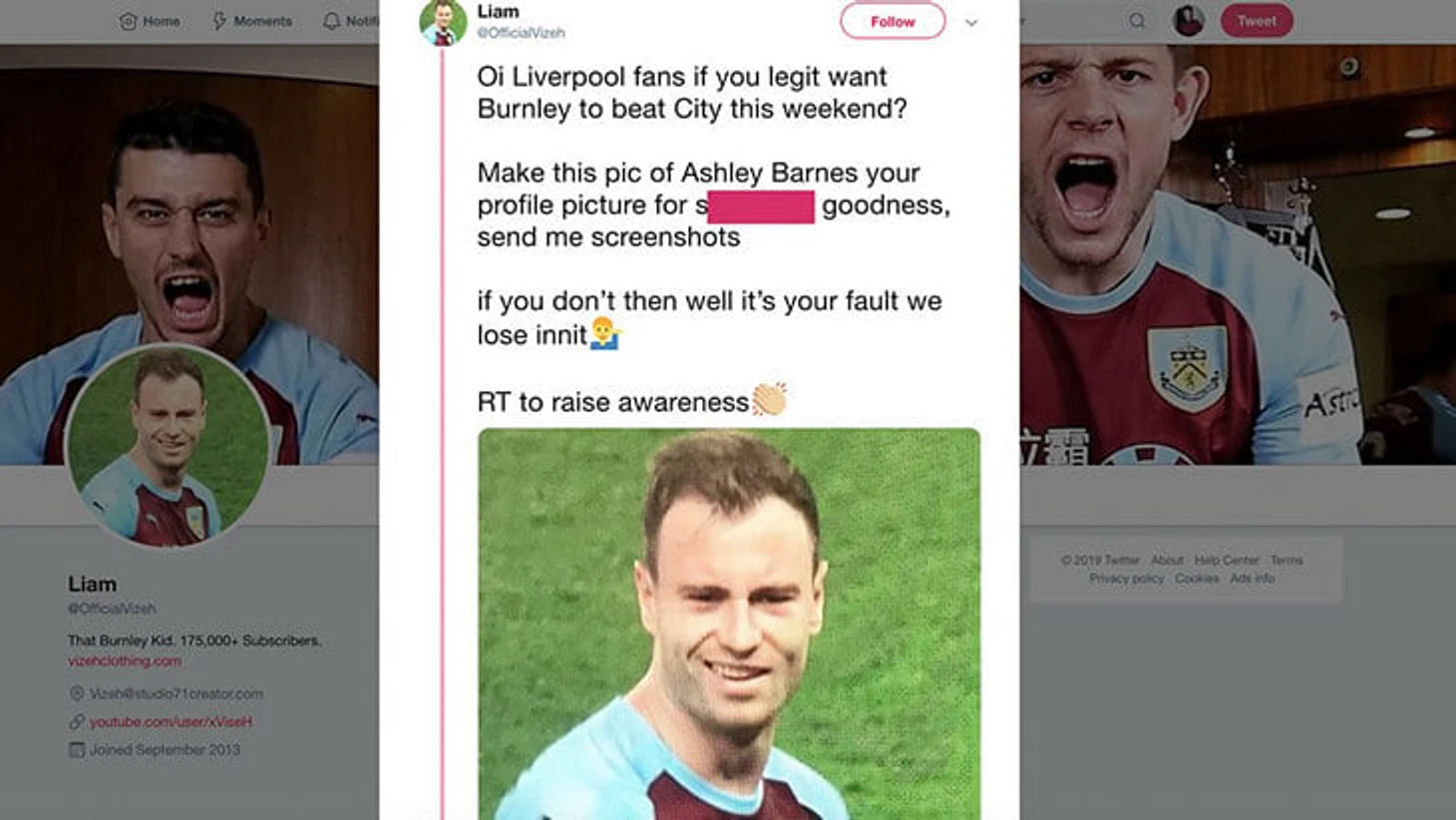 «Привет, фанаты «Ливерпуля». Вы действительно хотите, чтобы на этих выходных «Бернли» победил «Сити»? Тогда ставьте на аватары эту фотографию Эшли Барнса и присылайте мне скриншоты. Если не поставите, то наше поражение будет на вашей совести».