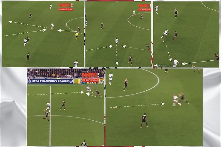 Трипьер бросил ван де Бека, но того должен "взять" Алдервейрелд, который в свою очередь бросает Тадича, на которого надо переключаться Санчесу. Вот тут и возникает прореха в защите, потому как защитники "Тоттенхэма" так грамотно сыграть не смогли. Ван де Бек пропускает мяч, а вот Алдервейрелд бросает "своего", так как Санчес с Тадичем играет безалаберно и фактически теряет его.