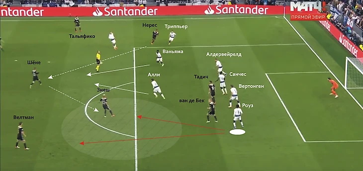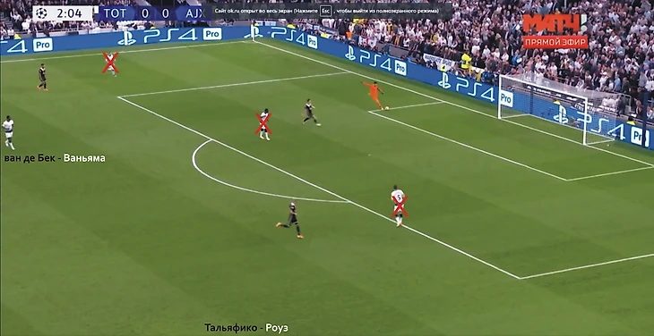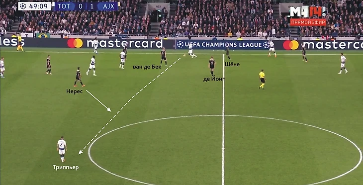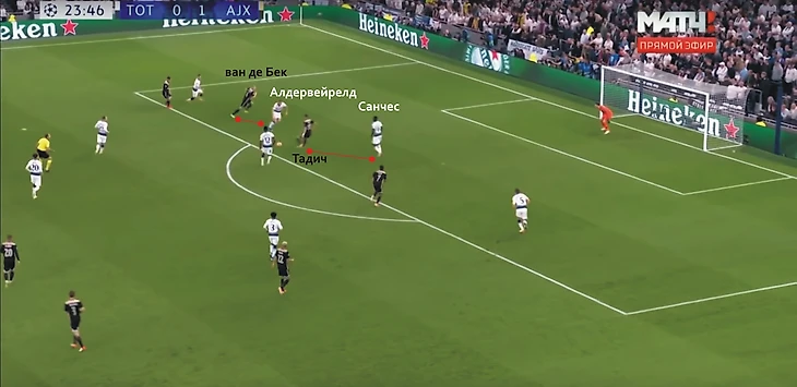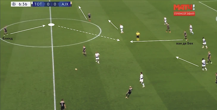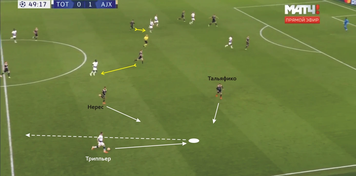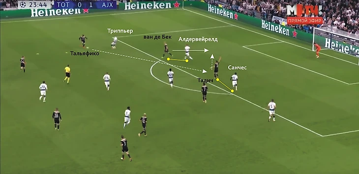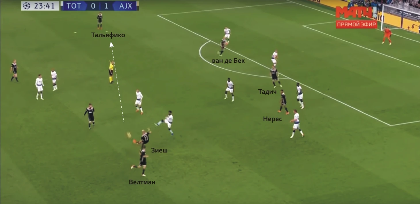 Зиеш сметился назад, вытянув Роуза. Остаётся тройка защитников, которая скована игроками атаки - тут и ван де Бек, который занимает позицию центрального нападающего. Крайние защитники высоко, Тальяфико получает пас, однако Триппьер занят ван де Беком, и защите "Тоттенхэма" надо срочно перестраиваться, грамотно передать игроков "Аякса", чтобы закрыть свой правый фланг.