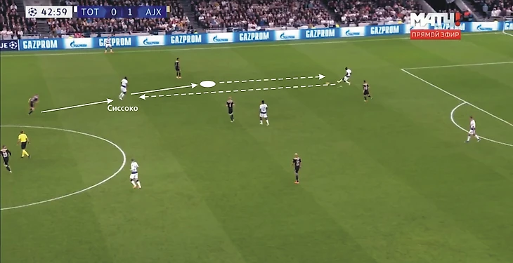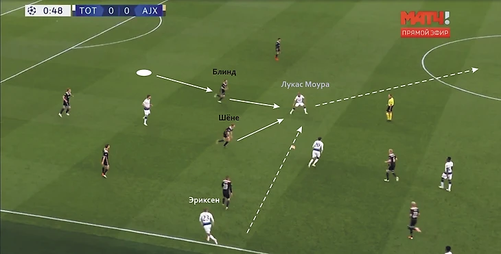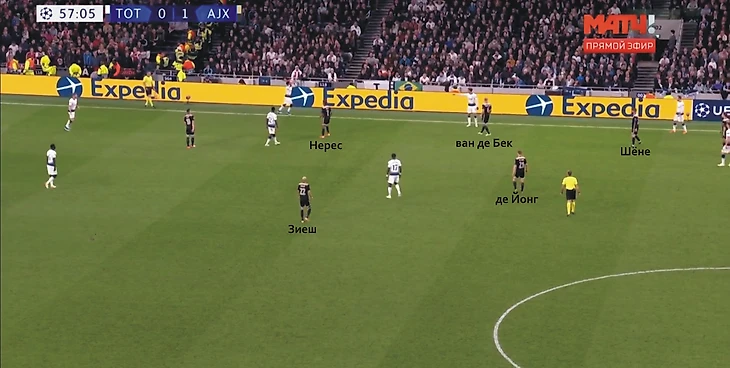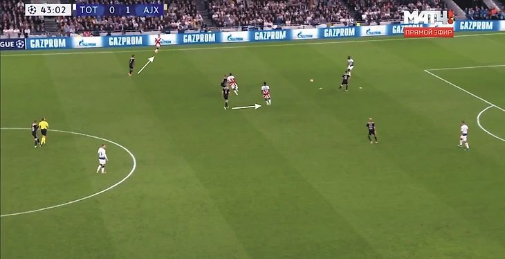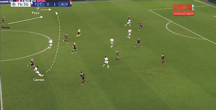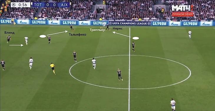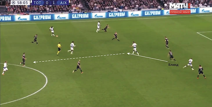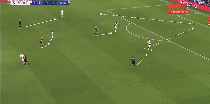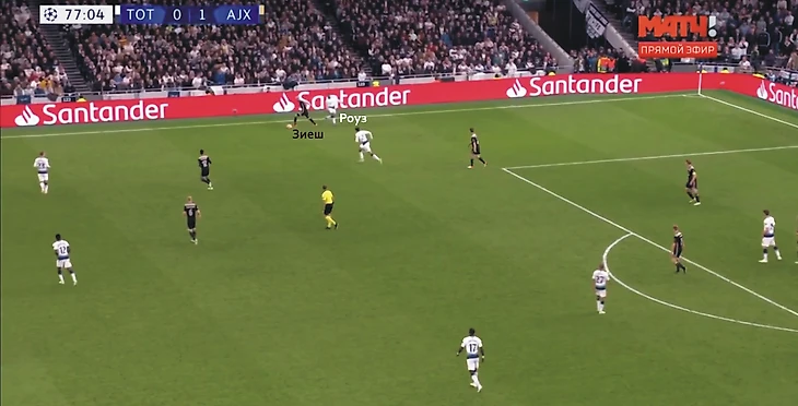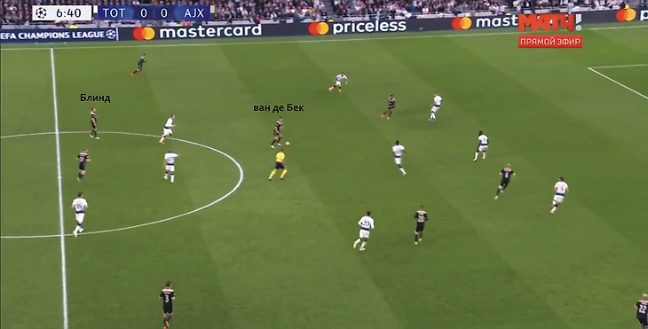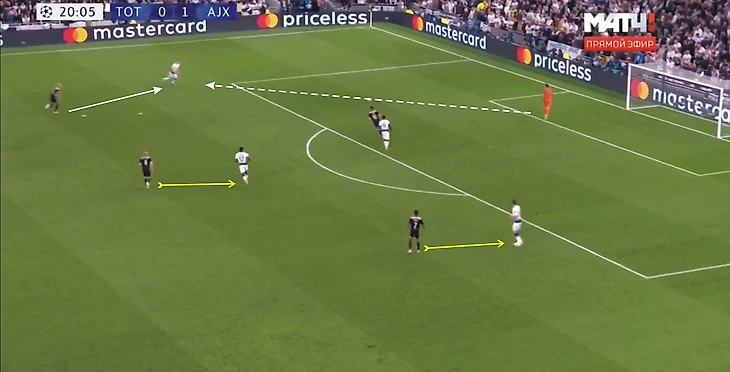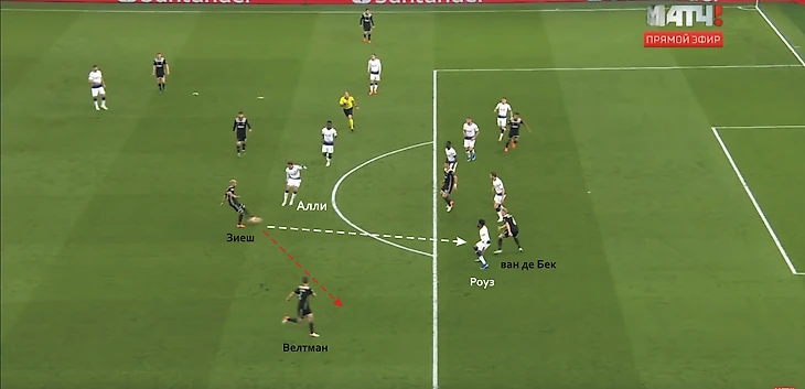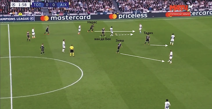 Зиеш сметился назад, вытянув Роуза. Остаётся тройка защитников, которая скована игроками атаки - тут и ван де Бек, который занимает позицию центрального нападающего. Крайние защитники высоко, Тальяфико получает пас, однако Триппьер занят ван де Беком, и защите "Тоттенхэма" надо срочно перестраиваться, грамотно передать игроков "Аякса", чтобы закрыть свой правый фланг.