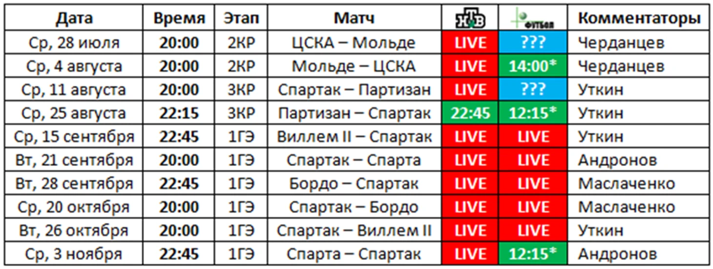 Выездной матч "Спартака" в Белграде был перенесён на полчаса раньше, из-за чего его трансляция прошла в записи - НТВ не стал перестраивать программу. В остальном показ турнира был идеальным - прямой эфир, обеспеченный во многом удобным временем начала домашних матчей - 20:00 по Москве (про это я уже говорил в предыдущем выпуске). Футбольный канал по какой-то причине дублировал гостевые встречи "красно-белых" с "Виллемом II" и "Бордо", хотя в это время шли другие матчи турнира ("НТВ-Плюс Спорт" после создания нового канала футбол почти не показывал). Игра "Спартак" - "Партизан" в программе указана не была, основной источник - запись матча, лежащая в сети.