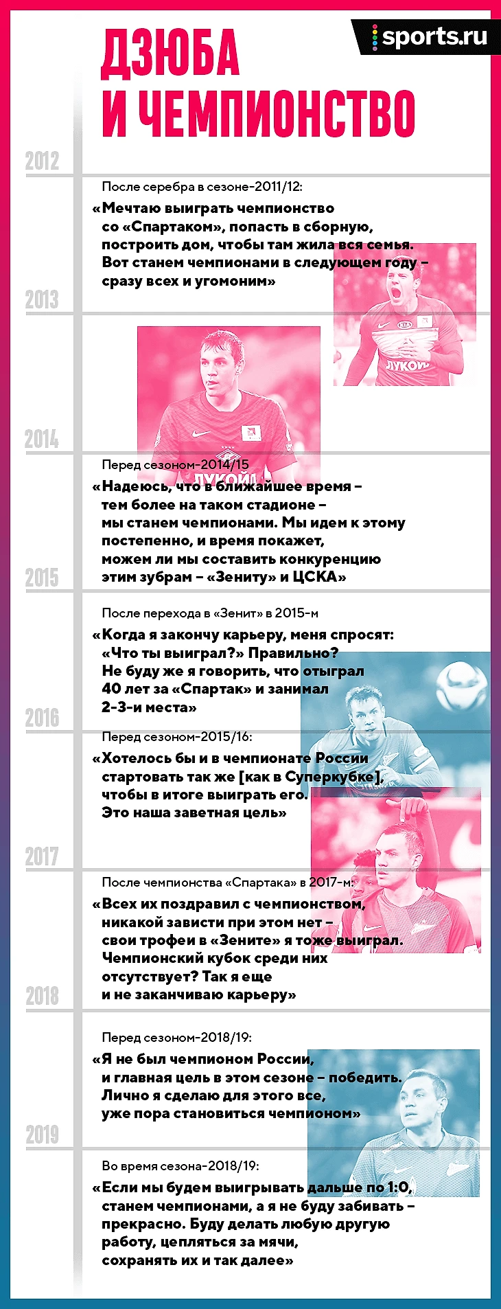 «В мире спорта главное после окончания карьеры то, что ты выиграл, любой трофей очень важен, – говорил Дзюба перед сезоном-2018/19. – Но я не был чемпионом России, и главная цель в этом сезоне – победить. Лично я сделаю для этого все, уже пора становиться чемпионом».