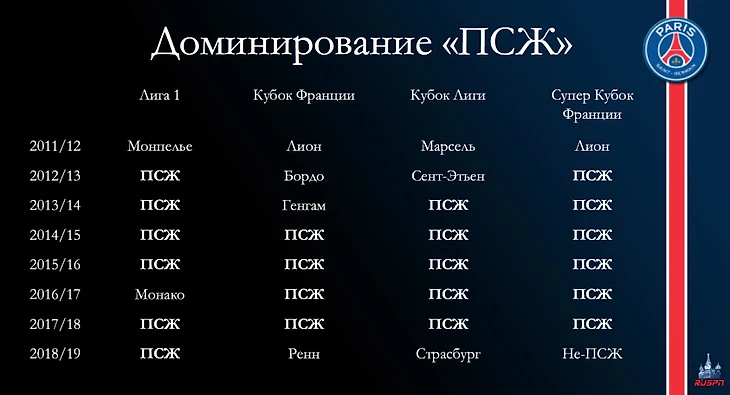 Также катарских инвесторов обескураживает отношение общественности к их стараниям. QSI и вправду за время их правления превратил «ПСЖ» в «большой клуб», хотя бы по французским меркам. Вот их успехи во Франции с 2011 года.