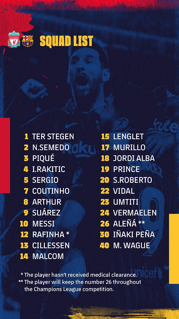 В заявку на второй матч полуфинала Лиги чемпионов против «Ливерпуля», который пройдет на «Энфилде» 7 мая, попали все игроки основы, сыгравшие с «красными» на «Камп Ноу», кроме травмированного Дембеле.