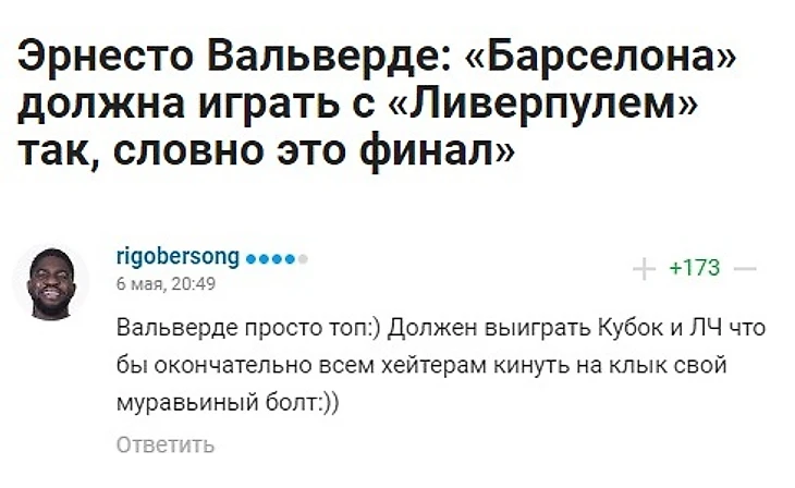 А так нам завещали обожать бездарного Эрнесто в феврале. Лишь только «Ливерпуль» здесь зрелищно играл, да и с мартышкой даже способна «Барса» победить в чемпионате с миллиардным годовым бюджетом. Умнее ли Вальверде той мартышки - вопрос серьезный.