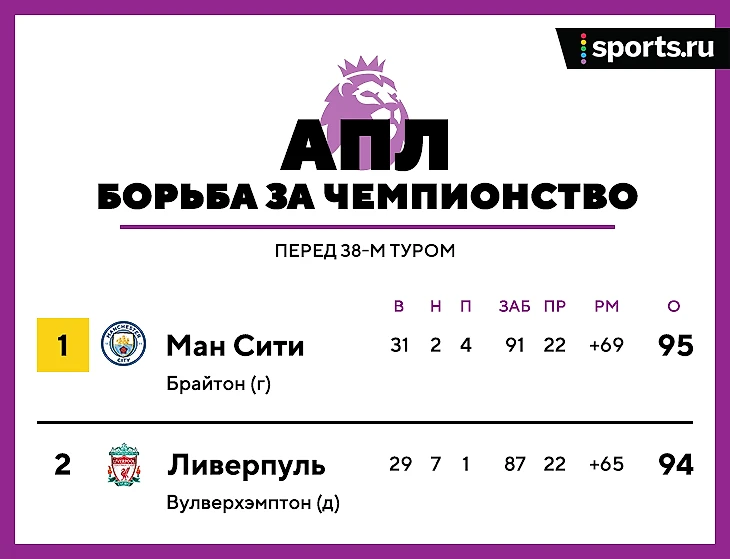 • За тур до конца «Манчестер Сити» опережал «Ливерпуль» на одно очко и играл в гостях с «Брайтоном». «Ливерпуль» – дома с «Вулверхэмптоном»