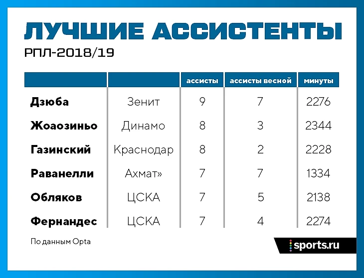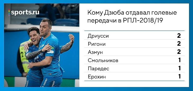 Кроме трешки в матче с ЦСКА, весной Дзюба отдал еще 2 голевые передачи в матче с «Крыльями Советов» и по 1 – в играх с «Динамо» и «Уфой». В первой части сезона Артем сделал ассист Ерохину в матче с «Оренбургом» (качественный пас в одно касание под выход 1-на-1 с вратарем) и Паредесу против «Крыльев» (скорее символическая голевая: пас Леандро Артем сделал еще в центре поля, после чего аргентинец продвинулся ближе к штрафной и пробил).