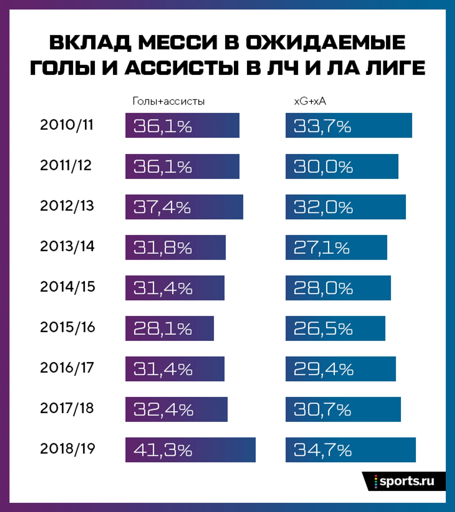 Промежуточный итог: Месси отвечает почти за половину заключительных действий (созидание и удары) и за треть продвижений мяча. Такой объем работы определенно дает ему максимум яркости, хотя зависимость кажется нездоровой. Но отчасти именно она подталкивает Месси к постоянному прогрессу.