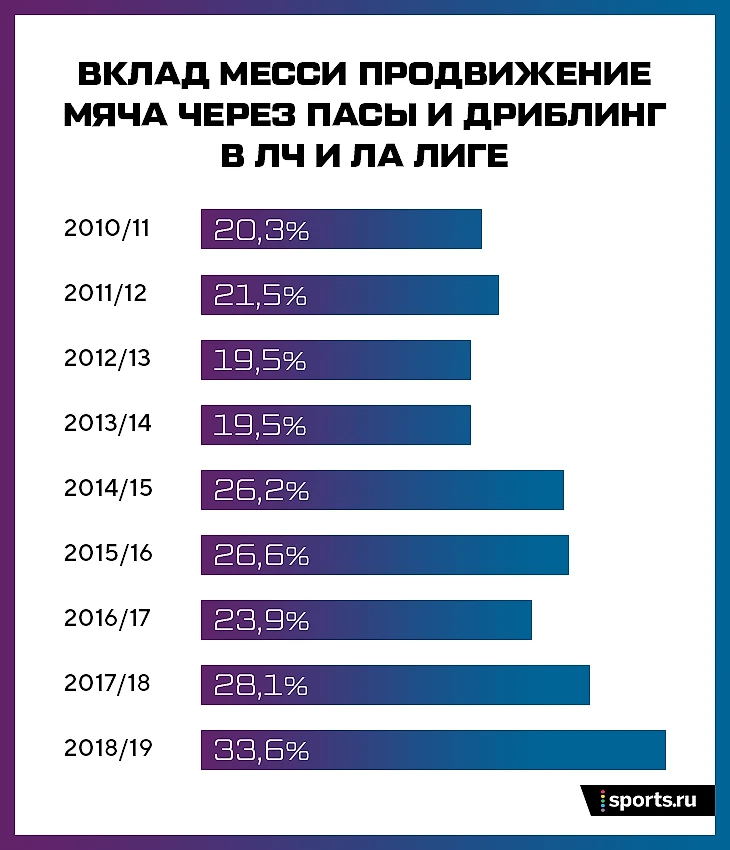 Аналогичным образом в последние годы Месси вывел на новый уровень игру в пас. Сначала это кажется бредом – Лео всегда обладал волшебными передачами. Например, с 2008-го ни один атакующий игрок не отдал больше передач вперед с лучшей точностью, чем Месси. Но в последние сезоны пас Месси слишком хорош по любым стандартам.