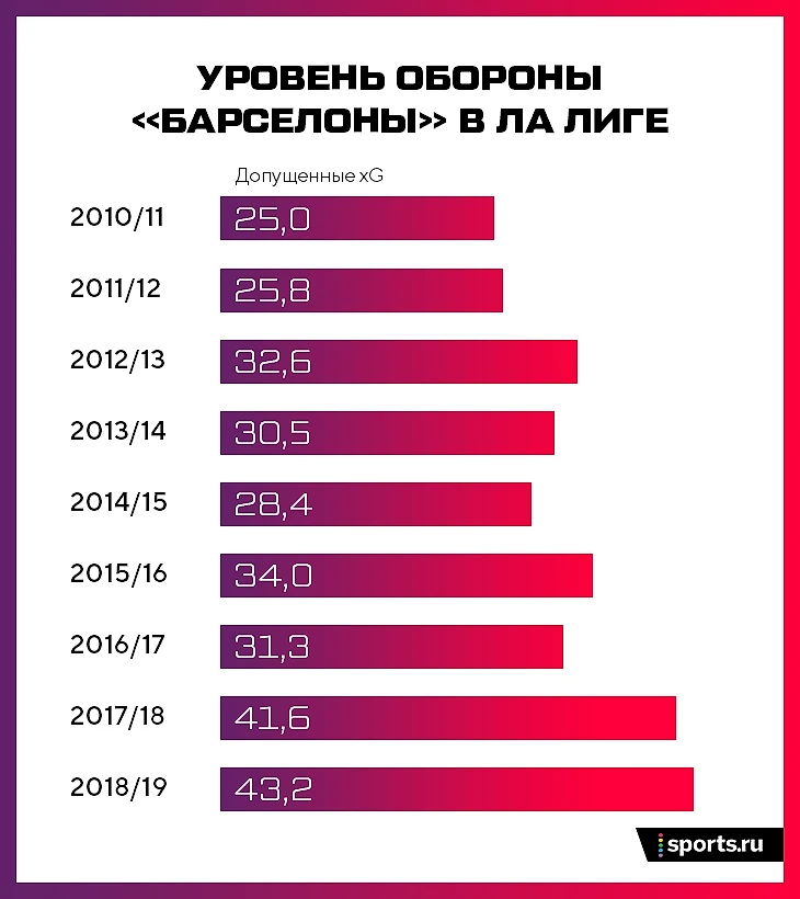 Снижение владения мигом ударило по оборонительной статистике. Так много моментов команда еще никогда не допускала. В последние годы этот кошмар маскирует великолепный Марк-Андре Тер Стеген, но изучение именно остроты допущенных моментов сразу выдает беду: