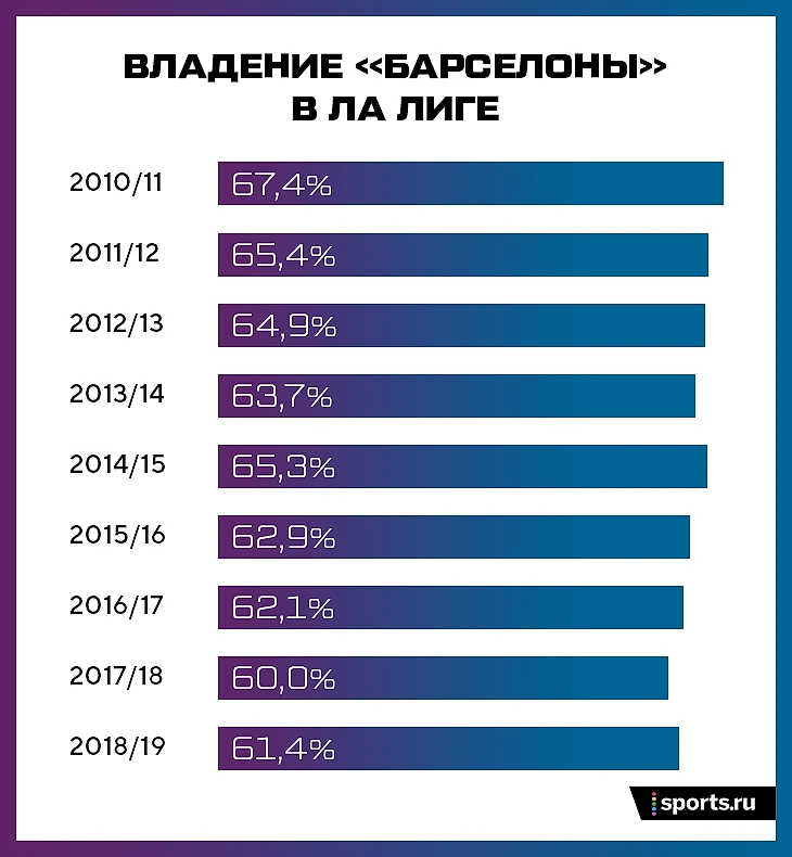 Это все равно лучший результат в Испании. Но два важных фактора: падение с 65% до 61% за 4 сезона – это очень много. Почти никогда команды не меняются так радикально. Именно для «Барсы» разница между очень много и просто много действительно имеет значение – владение для них не только инструмент атаки, но и гарантия того, что нужно реже позиционно обороняться. С этим всегда были серьезные проблемы.