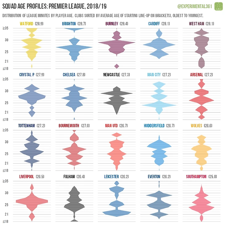 «МЮ», «Арсенал» и «Тоттенхэм» использовали весь спектр рассматриваемых возрастов (и примерно в одном и том же объёме).