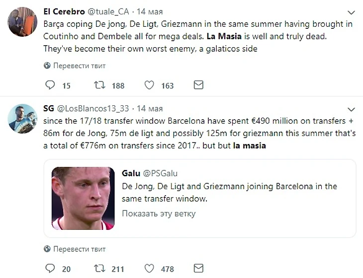 Пользователь @LosBlancos13_33 отмечает: «с сезона 17/18 «Барселона» потратила на трансферы 490 миллионов евро, а этим летом заплатят 86 миллионов за де Йонга, а также могут потратить 75 миллионов на де Лигта и 125 - на Гризманна, что в сумме дает 776 миллионов евро на трансферы с 2017-го... но ведь «Ла Масия»». К слову, написаны были эти сообщения с интервалом в 1 минуту.