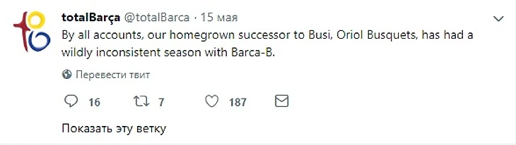 Чем же ответили самопровозглашенные фаны «Барсы»? Хейтеры «Ла Масии» уже нашли оправдание для ожидаемого огромного числа наемников в полузащите, способных подменить (или даже сменить) Серджи Бускетса, @totalBarca применительно к новости о Родри пишет: «Судя по всему, наш собственный воспитанник Ориоль Бускетс, считавшийся наследником Бускетса, провел дико противоречивый сезон в «Барсе Б»». Этот же аккаунт ждал «бальзама для успокоения ран» в игре «Аякса», после чего выражал сочувствие голландскому клубу и обещал, что «де Йонг И де Лигт прибудут жаждущими реванша». Ну просто @totalAjax какой-то.