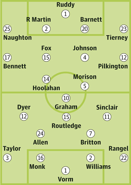 Под вопросом: Этеррингтон (проблемы со спиной), Джонс, Пеннант, Уилсон (все- травма подколенного сухожилия)