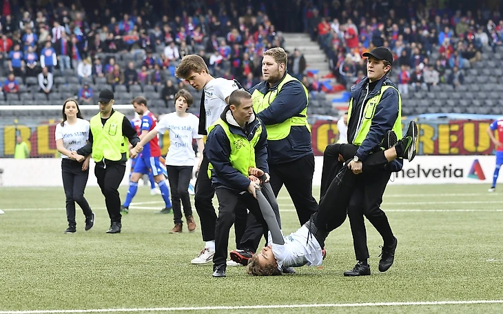 На 1-й минуте финала кубка Швейцарии на поле выбежали 5 студентов. Двое легли с плакатами в центральном круге, остальные – побегали от стюардов. Через несколько минут ребят вывели, а «Базель» и «Тун» начали игру.
