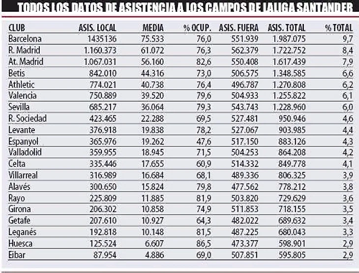 Самым популярным клубов Ла Лиги предсказуемо оказалась «Барселона», завоевавшая чемпионский титул. Матчи «блауграны» посетил 1 миллион 987 тысяч болельщиков (9,7% от общего количества зрителей).