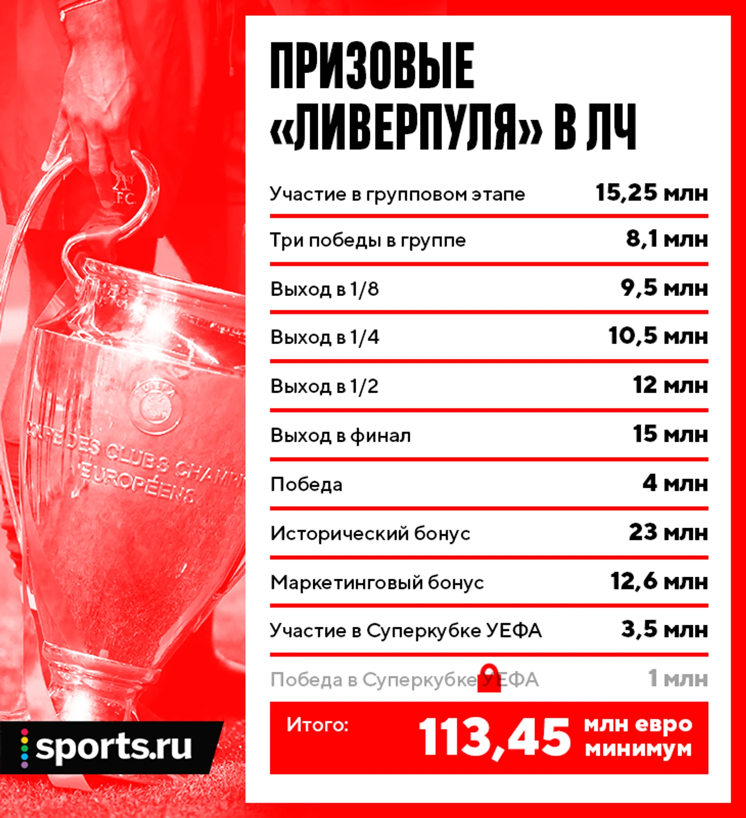 • На групповом этапе «Ливерпуль» заработал 32,85 млн евро (15,25 просто за участие, 8,1 млн за три победы и еще бонус 9,5 млн за выход в 1/8 финала).