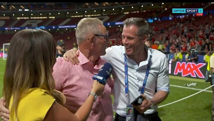 Потом в интервью ворвался Джейми Каррагер и минуту обнимал папу капитана.