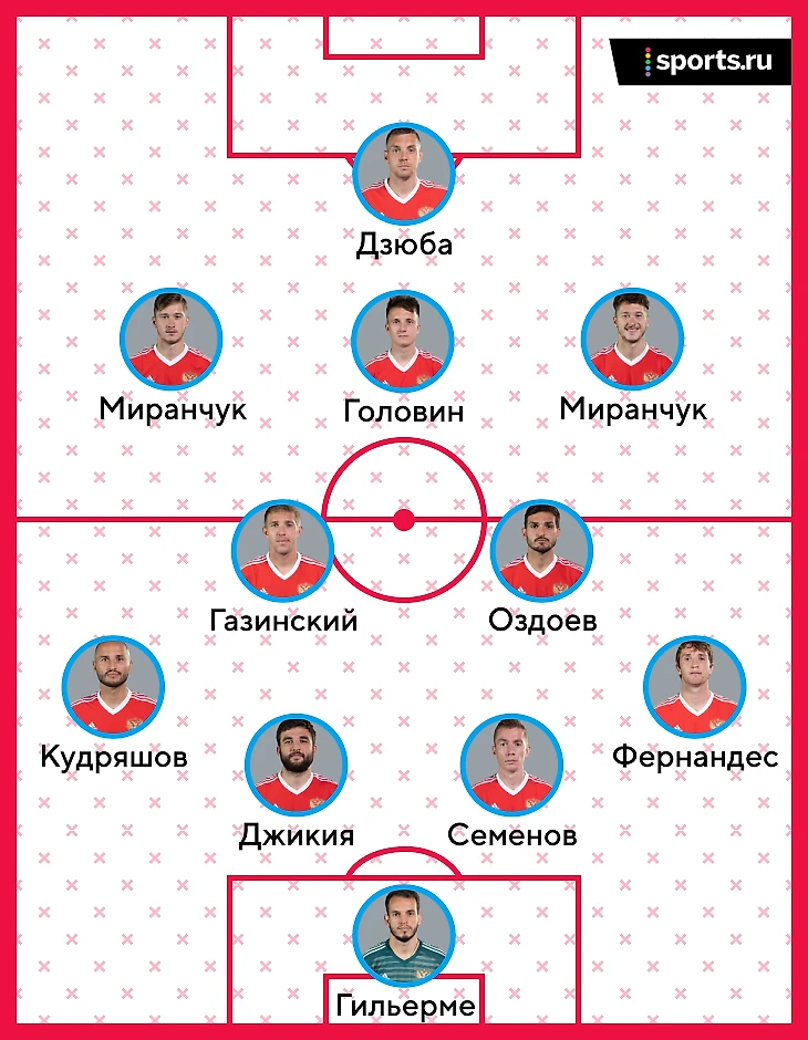 Голы: 1:0 – Дзюба (7), 2:0 – Антон Миранчук (26), 3:0 – Головин (42), 4:0 – Смолов (46), 5:0 – Чалов (63), 6:0 – Мирзов (80).