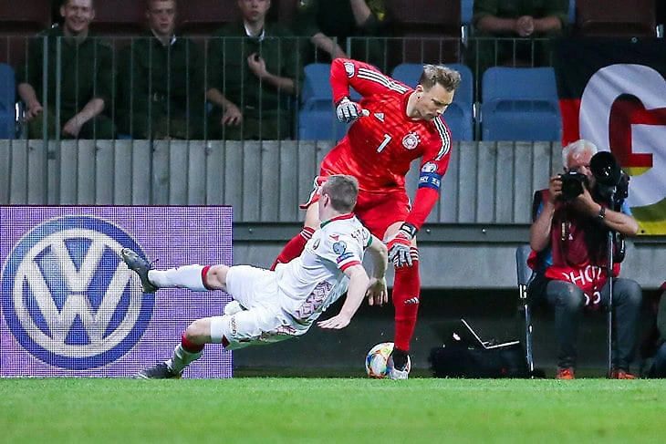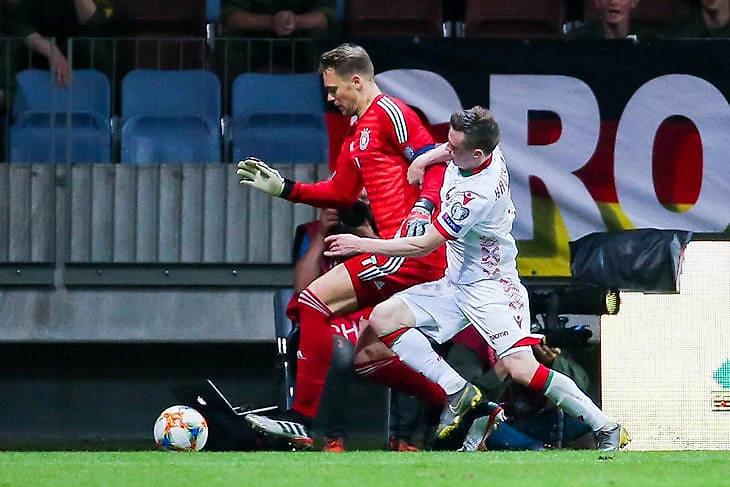 На 30-й минуте нападающий Юрий Ковалев оказался с мячом на углу штрафной – вполне себе опасный момент. Но Нойер выбежал навстречу, вытеснил к угловому флагу, уверенно отобрал мяч, а потом хитрым финтом (разворотом Кройффа) уложил белоруса на газон. В 99% случаев вратарский дриблинг приводит к провалу, у Нойера все получилось красиво.