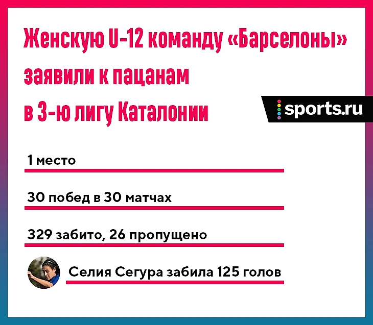 Подготовка юных игроков «Барселоны» в прошлом сезоне вышла на новый уровень. Женскую команду U-12 заявили в лигу к каталонским мальчикам той же возрастной группы. «Барса» не первый клуб в Испании, кто до такого додумался (это уже делали «Атлетико» и «Атлетик»), но таких результатов мы еще не видели: 30 побед в 30 матчах, забито 329 голов, пропускали меньше гола за игру – 26. Занявший второе место «Спортинг» отстал на 11 очков и 66 забитых мячей.