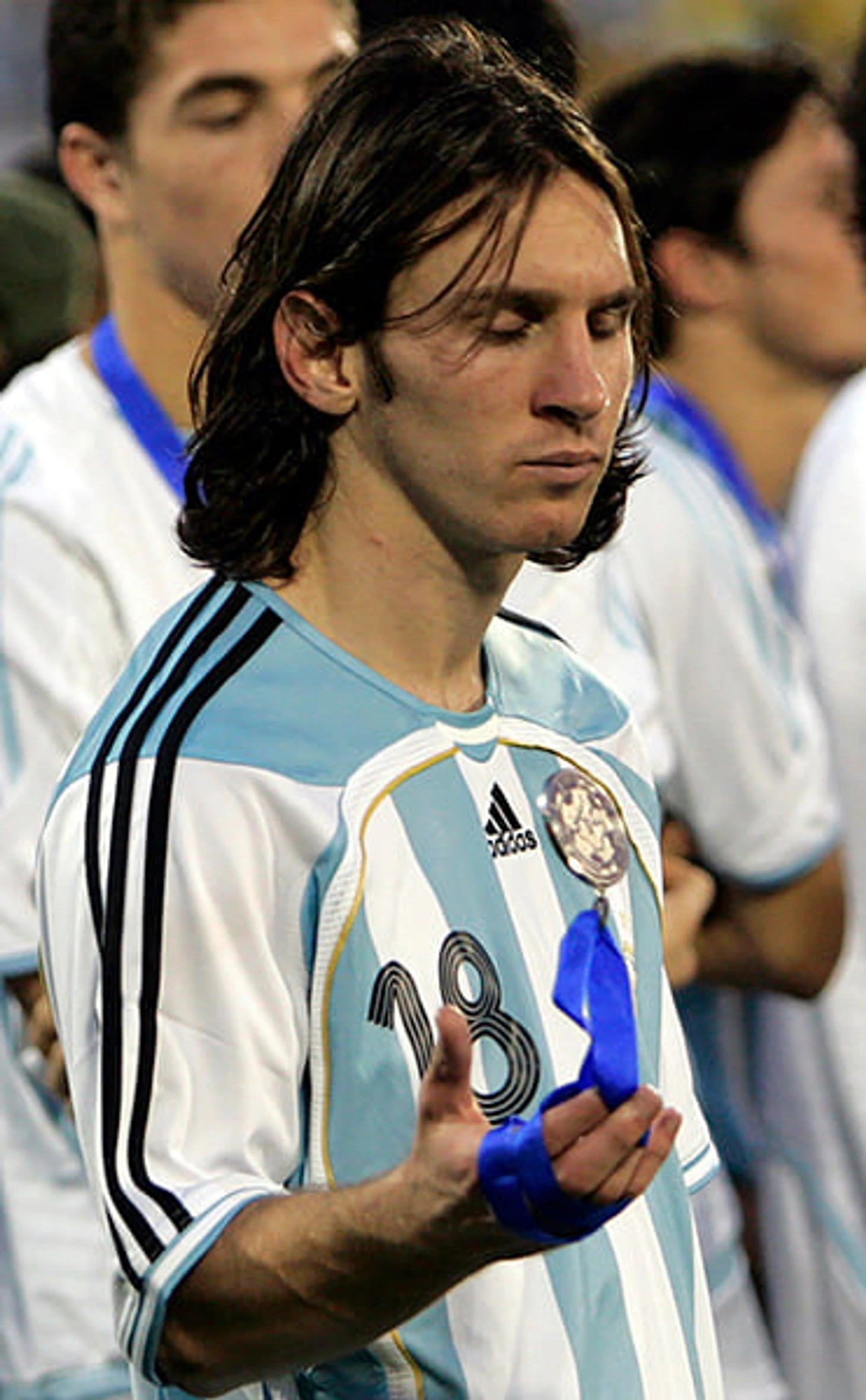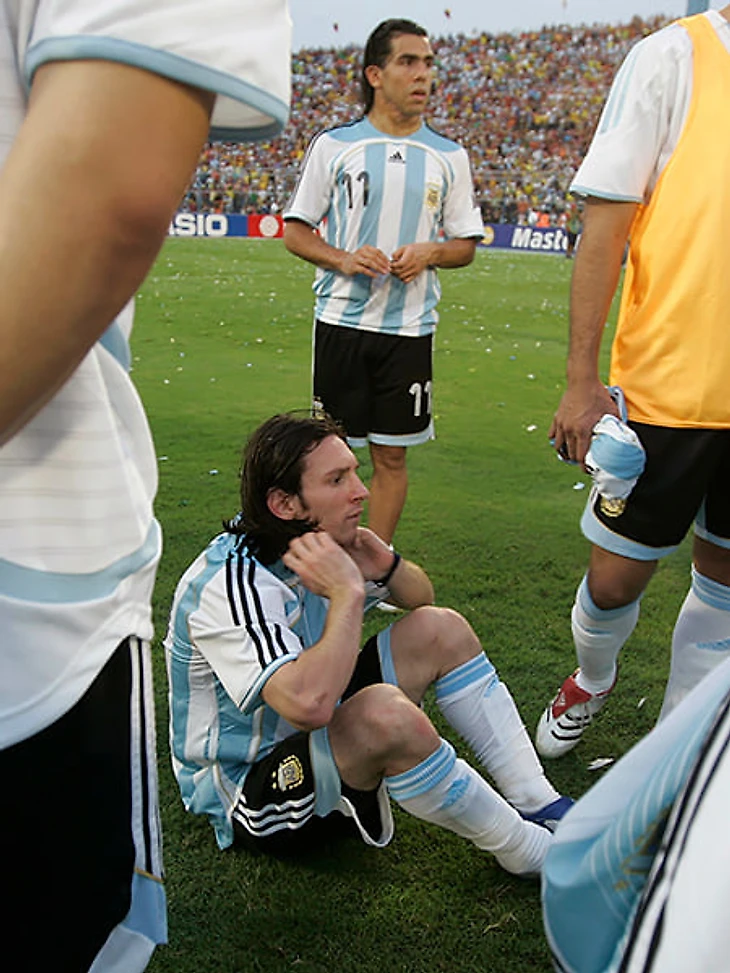 Кубок Америки-2007 – первая грусть Лионеля Месси в сборной. Аргентина дошла до финала, где снова уступила Бразилии. Только теперь без особых шансов – 0:3. Пока Вагнер Лав гонял по полю с Кубком, Месси крутил в руке медаль и был очень-очень расстроен.