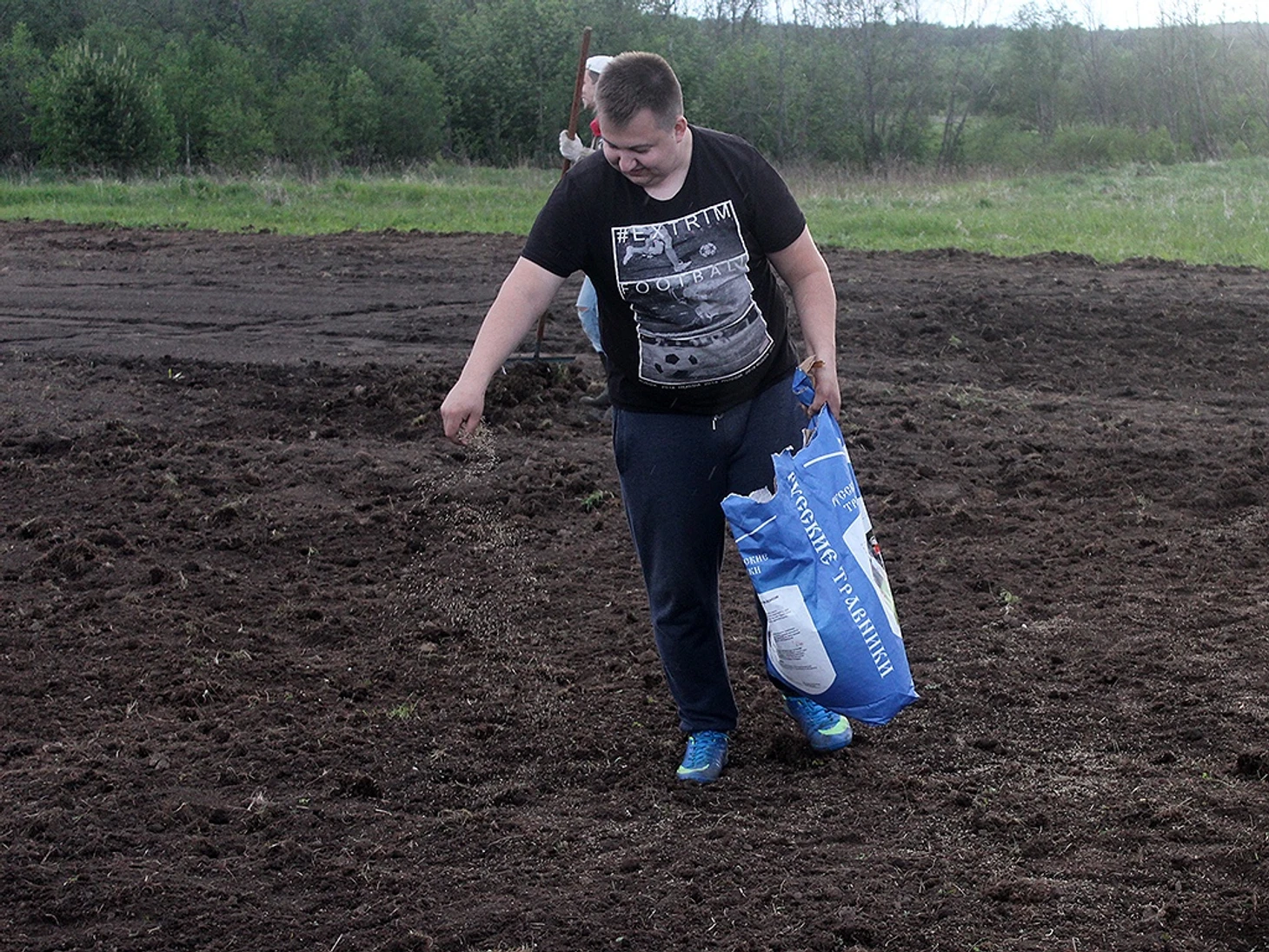 Поэтому осенью начались аграрные работы. Азат Хаматханов, учитель физкультуры полдневской школы, вместе с отцом с помощью специальной техники подняли целину. А в конце мая местный житель Павел Раскостов откликнулся на нашу просьбу. Он культиватором вспахал и выровнял землю.