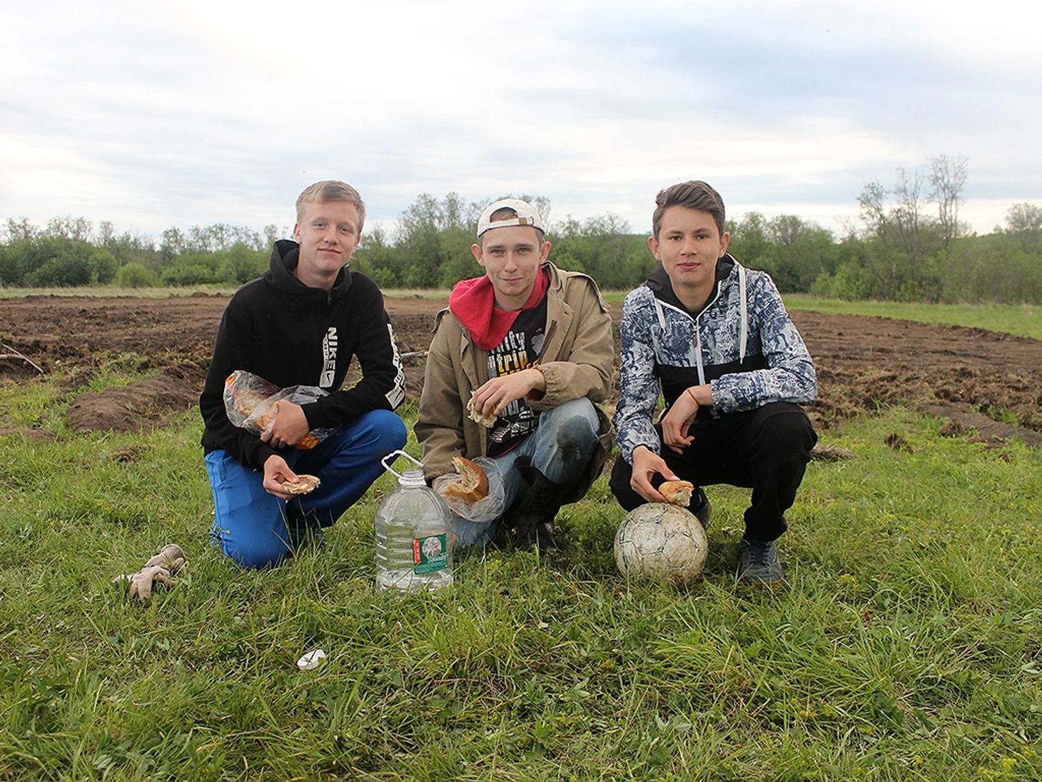 Вся работа в тот день заняла 6,5 часов. Постоянно в Полдневой вместе с парнями играют в футбол три девочки. Это Валерия Худайберганова, Мария Гребенюк и Олеся Гайданова. Девочки пришли и в этот день. Конечно, тяжелую работу мы им дать не могли. Они убрали скошенную траву и спросили: «А играть сегодня будем?». Услышав положительный ответ, они куда-то ушли. Оказывается, девочки решили нас порадовать. Они купили еду, набрали воды и вернулись. «Таким вкусным хлеб ещё не был» - сказал Федя Кочнев во время дружного перекуса.