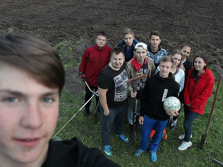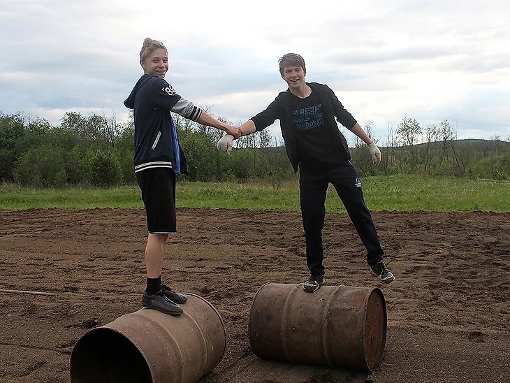 В перерыве между аграрными работами мы скосили небольшую площадку рядом. Трава на главной арене взойдёт не быстро, а играть где-то надо. Альтернативным вариантом была асфальтированная площадка около школы, где дети играли весной. Теперь у них есть более безопасная поляна, а у стадиона «Сантьяго Полдневая» появилось запасное поле.
