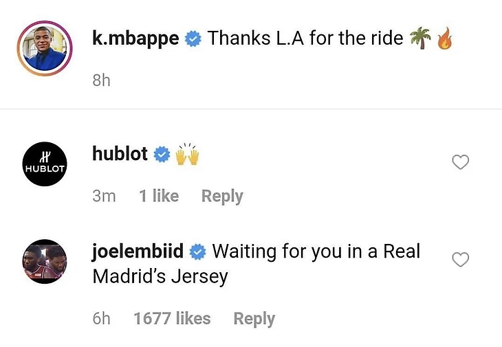 Центровой «Филадельфии» Джоэл Эмбиид присоединился к числу тех, кто хотел бы видеть Килиана Мбаппе в чиле игроков мадридского «Реала». Эмбиид оставил комментарий: «Жду тебя в футболке «Реала» к одному из постов француза в Инстаграме.
