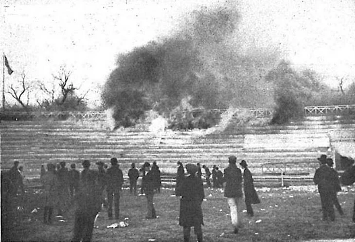 Ажиотаж перед игрой между двумя главными футбольными соперниками континента, в которой решалась судьба титула, был огромным – о радио- или телетрансляциях игр тогда можно было только мечтать (первая голосовая трансляция спортивного события состоялась в апреле 1921 года в Питтсбурге, и тогда комментировали бокс). Из-за недостаточного количества обслуживающего персонала и охранников, а также из-за суматохи с билетами (было напечатано не меньше 5 тысяч фальшивок) матч пришлось прервать через пять минут после его начала из-за фанатов, которые начали выбегать с переполненных трибун прямо на поле. Когда футболистов увели с газона, между болельщиками уругвайцев и аргентинцев началась потасовка, а вскоре вспыхнули деревянные трибуны – кто-то поджег их с помощью бензина, слитого из автомобилей на ближайшей стоянке.