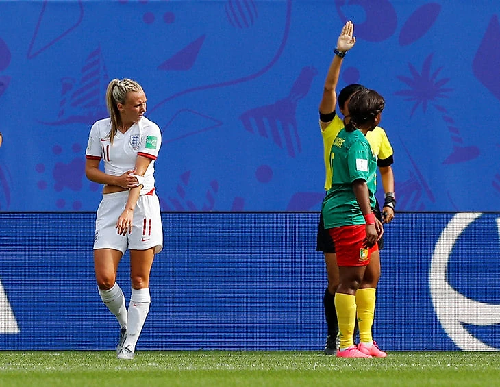 В 1/8 финала женского ЧМ сегодня играли Англия и Камерун. После второго гола англичанок главный судья Лианг Ким обратилась к VAR. В моменте с голом боковой подняла флаг, но повтор показал, что Эллен Уайт забила по правилам.