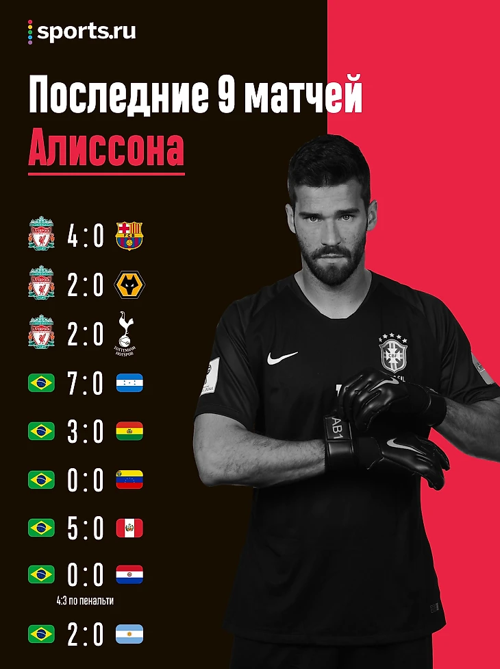 • Если Алиссон отстоит на 0 еще и в финале Копа Америка, то практически достанет до другого рекорда Таффарела (который сейчас тренирует вратарей в сборной). У Клаудио было 8 подряд клиншитов за сборную Бразилии, у Беккера – пока что 6. В финале бразильцы встретятся или со сборной Чили, или со сборной Перу.