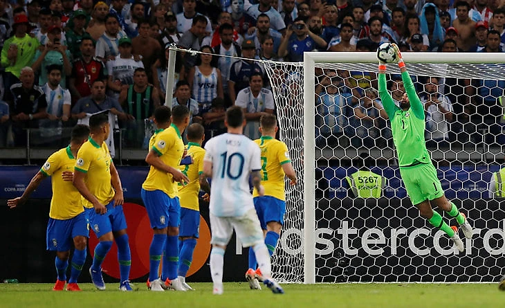 Вчера ночью Бразилия обыграла Аргентину в полуфинале Копа Америка. Главным героем стал Дани Алвес, а вратарь Алиссон Беккер отстоял 9 подряд матч на 0. На этом турнире он еще не пропустил ни гола. В последнем матче он отбил 2 удара аргентинцев в створ. В том числе и вот такой штрафной от Лео Месси.
