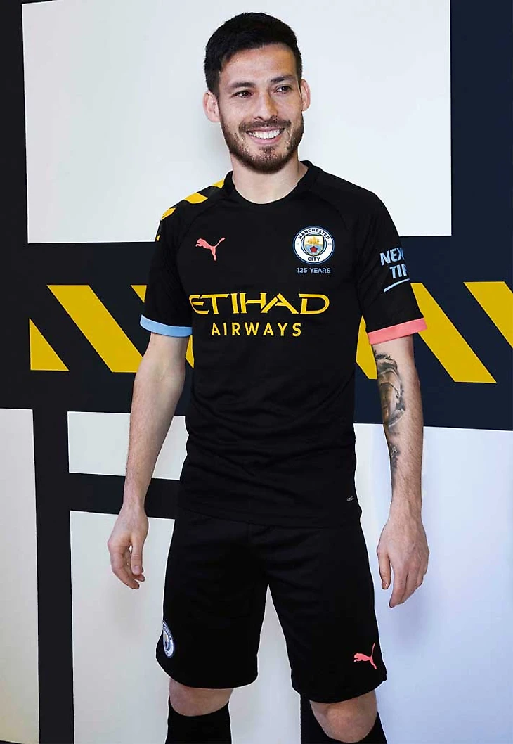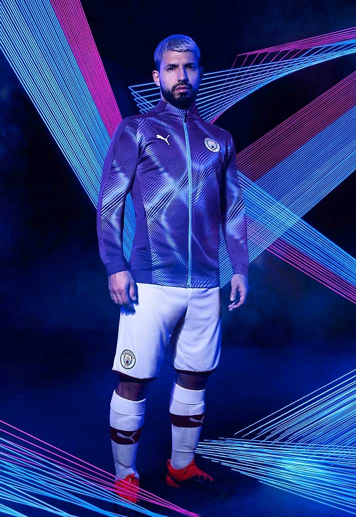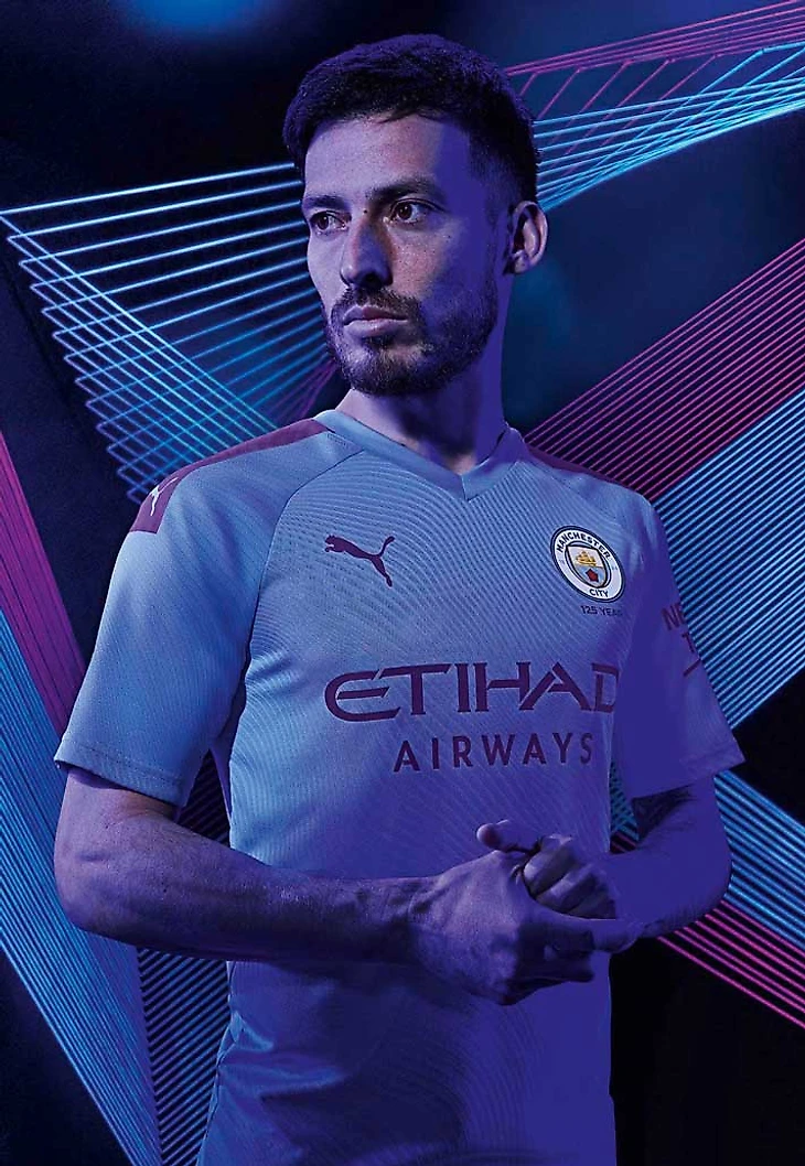 Впервые привычный синий цвет домашней формы Сити детализируется фиолетовым на плечах, надписи спонсора и бренда.